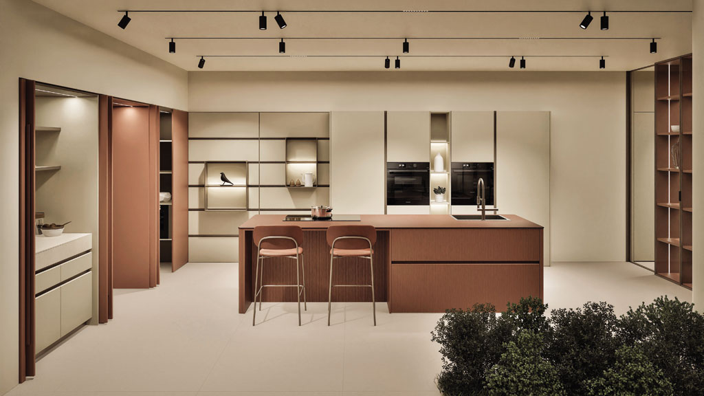 Questo passaggio è evidente nelle composizioni presentate dai principali brand. Le nuove cucine diventano architettura domestica: superfici che si estendono, materiali che si rincorrono da un elemento all’altro, volumi che si integrano con il living. Il risultato è uno spazio più fluido, più aperto, più vicino al modo reale in cui viviamo la casa.
